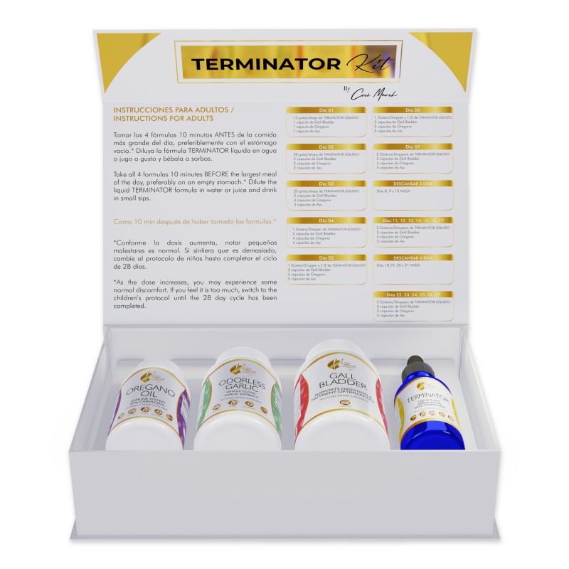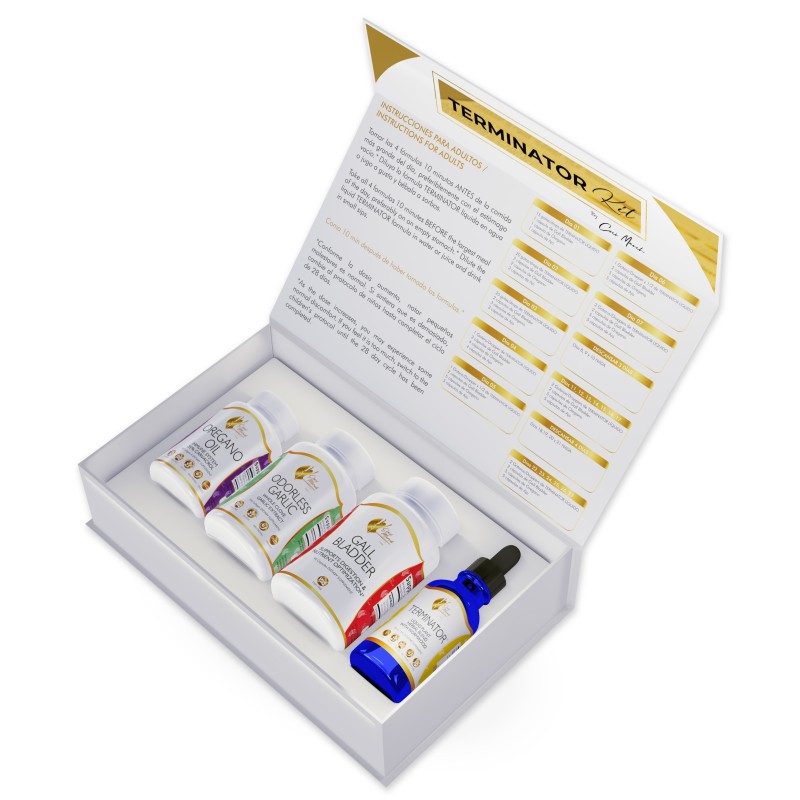 This Kit is composed of four formulas of high concentration and repairing power. Liquid Terminator, Whole Clove Garlic Extract (aged garlic), Oregano with a high concentration of Carvacrol and my exclusive formula for the gallbladder.